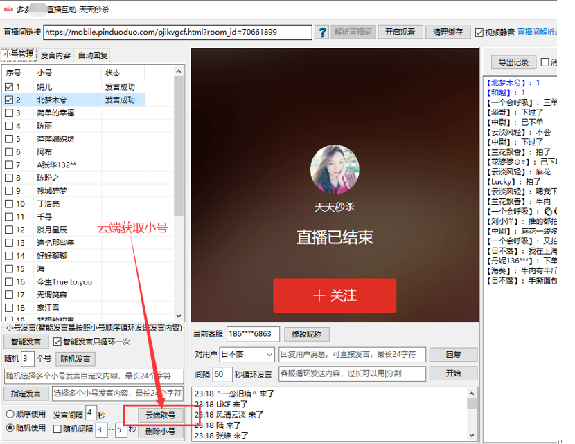 二、直播辅助:内置大量云端账号,支持免费下载试用,试用期间单次获取二十个账号,软件会员一次性200个!不限次数重新云端获取!库存几十万小号不重复!