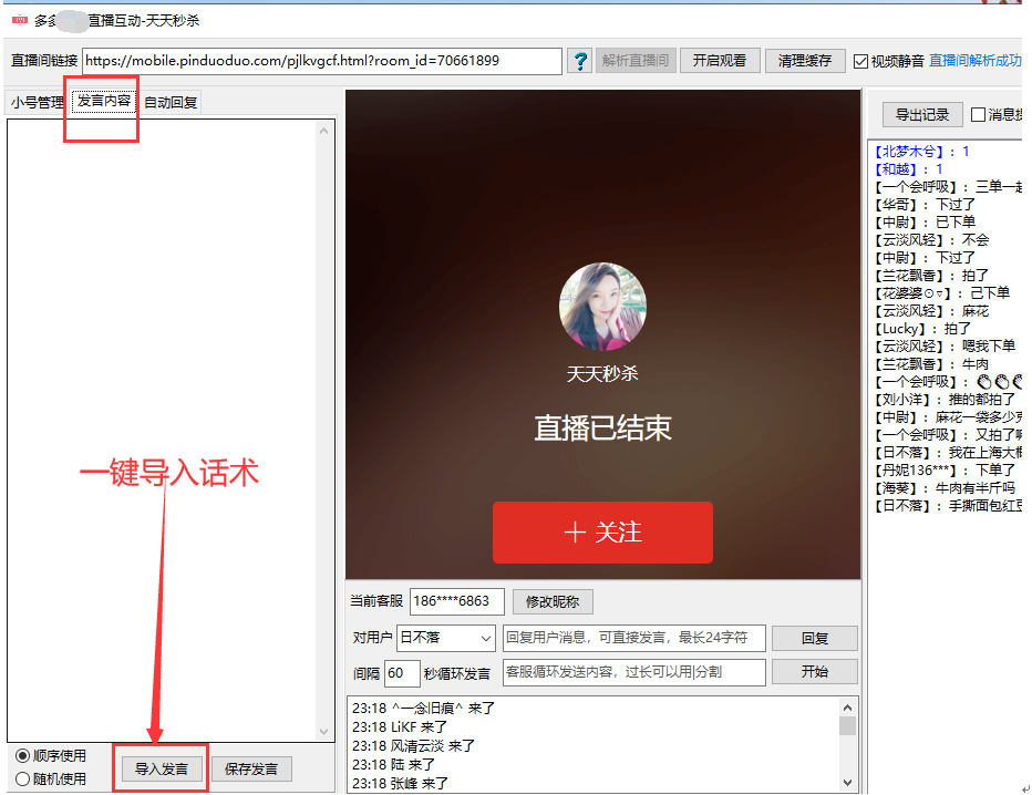 三、直播助理:可随机或指定账号互动发言,删除不爱账号,批量导入自定义内容,或统一单独设置发言,随机或顺序间隔设置。
