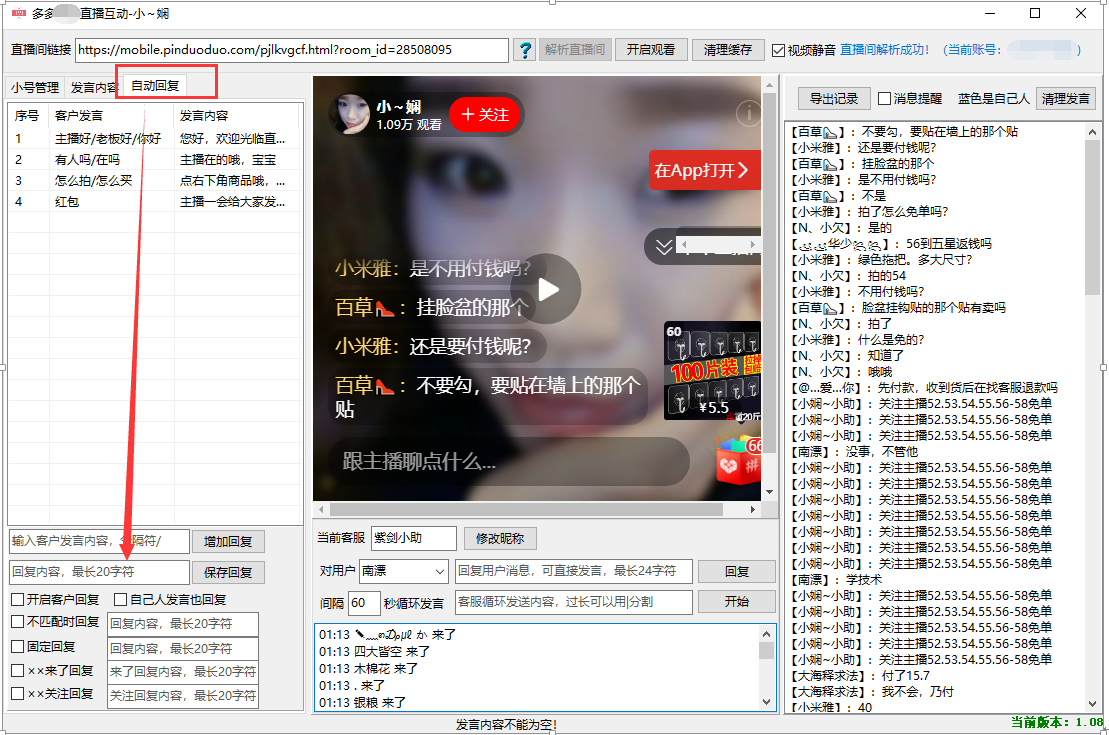 直播间智能客服:回复客服昵称可修改,支持自动回复,XXX来了/XXX关注回复,自定义回复内容,使得直播间流量也得到了保障