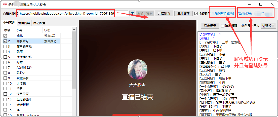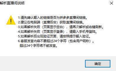 备注:解析成功会有提示直播间解析成功!并且有显示当前登录账户,没有以上显示就是解析失败,解析失败参考